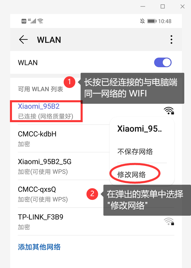 (3) 将提示框中的 IP 地址与端口号记住后,将手机 (这里以 Android 手机为例) WIFI 连接与 PC(电脑端) 同一网络的 WIFI,然后在手机 WIFI 列表中长按已经连接的 WIFI,在弹出的菜单中选择 修改网络 如图所示。
