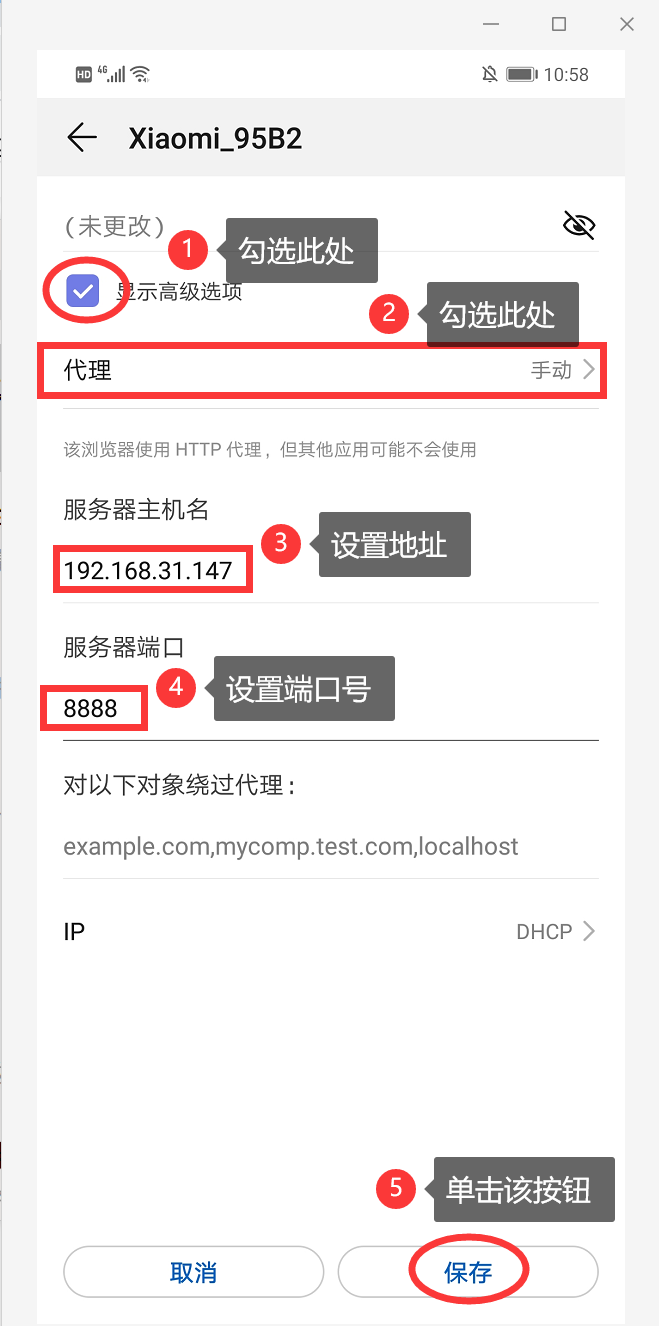 (4) 在修改网络的界面中,首先勾选 显示高级选项,然后在 服务器主机名 与 服务器端口 所对应的位置填写 Charles 的移动设备安装证书的信息提示框中所给出的 IP 与端口号,单击 保存 按钮。如图所示: