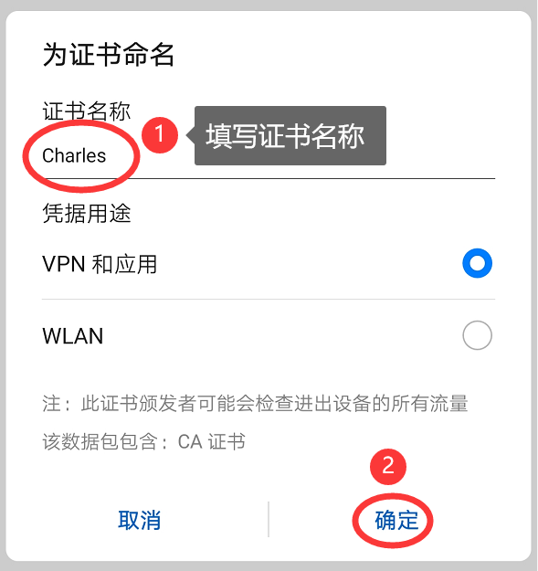 (3) 将 Charles_SSL 证书文件导入手机中,然后在手机中依次选择 设置 ⇒ 安全和隐私 ⇒ 更多安全设置 ⇒ 从 SD 卡安装证书(凭据),选择 Charles_SSL 证书文件,输入手机密码后设置证书名称,单击 确定 按钮。如图所示。