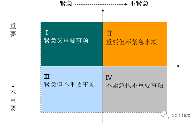 道理大家都懂,但是做起来是非常难。根据四象限法则,我们将事项分为4个类型,各自在不同的象限。紧急又重要事项、重要但不紧急事项、紧急但不重要事项、不紧急也不重要事项。正确的做法是将焦点放在重要但不紧急事项上。第四象限的事件大多是些琐碎的杂事,没有时间的紧迫性,没有任何的重要性,这种事件与时间的结合纯粹是在扼杀时间,是在浪费生命。