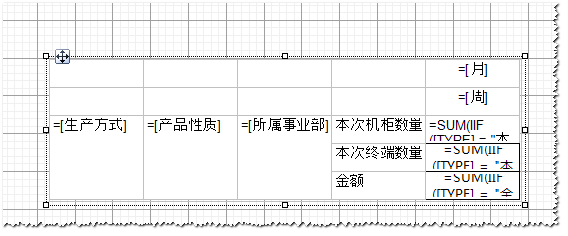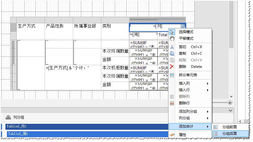 添加动态列:本节报表结构相对简单,只有一行“=【月】”字段的动态列,该列包含“=【周】”和按周小计。