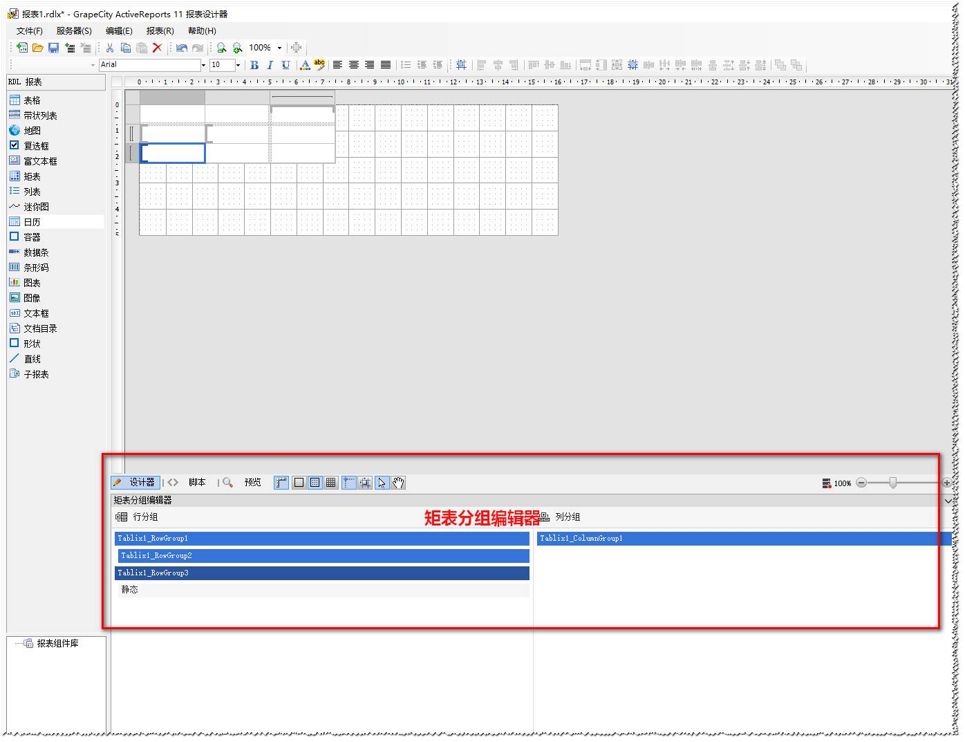 添加矩表控件后,会发现有类似 [ 符号,表示分组,即可根据具体数据动态生成行。会发现设计器下面的矩表分组管理器;