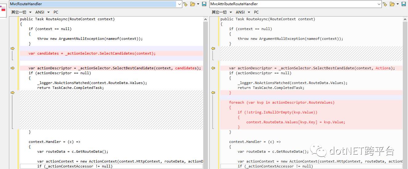 我们再看一下这两个处理程序的 RouteAsync 方法,这个方法是路由组件的入口方法,我们通过一个对比工具来看一下两者之间的差距。