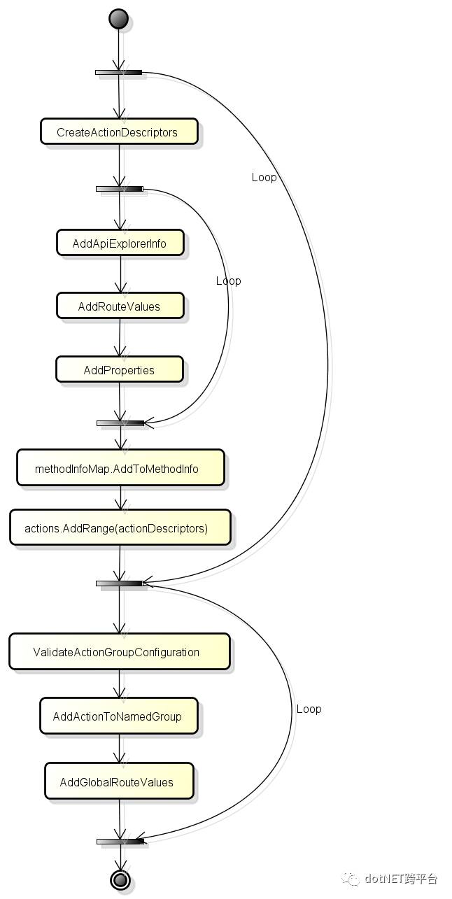 ControllerActionDescriptor的构建是基于ApplicationModel对象的,下面我就画了一个流程图用来展示构建 ControllerActionDescriptor 的整个过程,就不过多描述了。