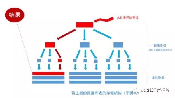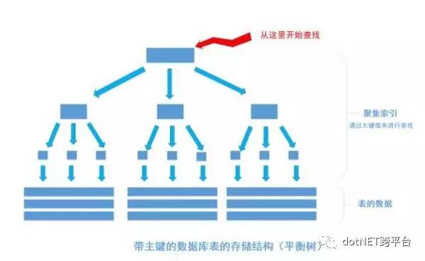 上图就是带有主键的表(聚集索引)的结构图。图画的不是很好, 将就着看。其中树的所有结点(底部除外)的数据都是由主键字段中的数据构成,也就是通常我们指定主键的id字段。最下面部分是真正表中的数据。 假如我们执行一个SQL语句:
