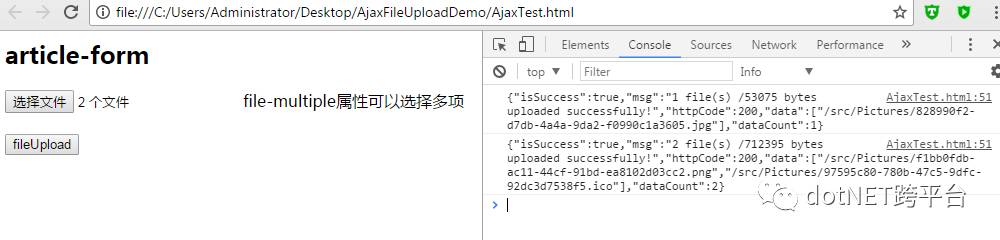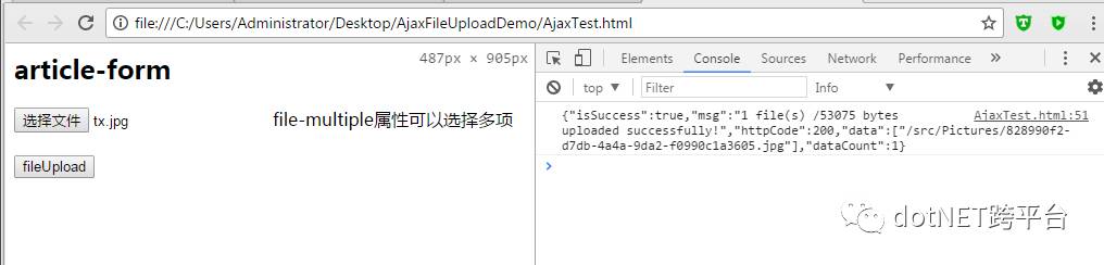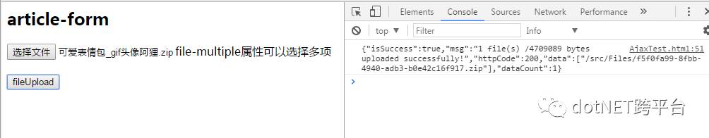 我们使用ajax的方式进行图片的上传操作,打开测试web页面,并且选择图片,点击上传,查看控制台返回的结果:
