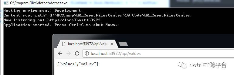 我们可以看到一个控制台和一个web自动启动,并且web显示默认的Values控制器的请求返回值。