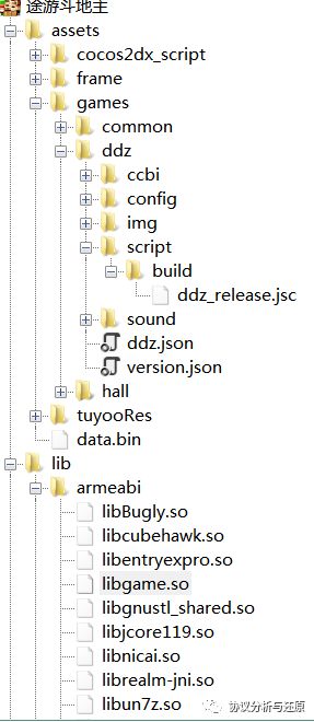 使用android killer打开APK包,看了下大体结构,游戏是使用cocos2dx开发的,斗地主的游戏主体在脚本ddz_release.jsc里面: