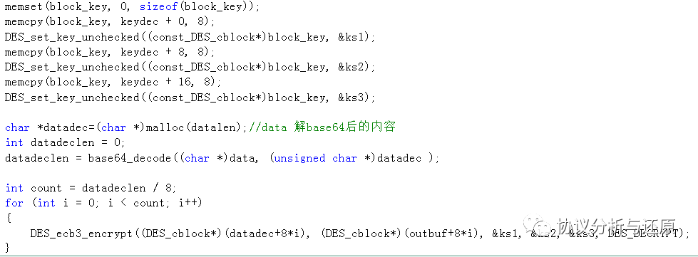 很明显,请求和响应里面的http体是base64编码的,解开base64是二进制,明显有加密,一番探索,得到结果,加密方法是DES_ecb3_encrypt,密钥固定24字节"dbbsRYnaQPKia/sCWJGRNAsQH7PLIw3a",直接上解密代码: