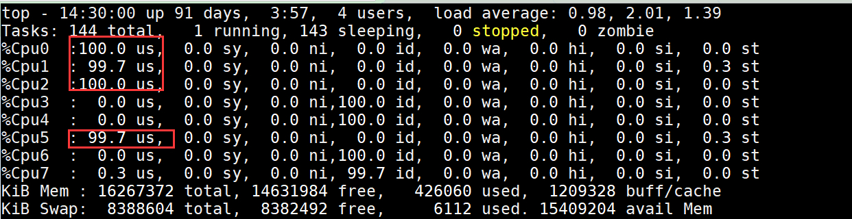 输入:top,然后按最上面的数字1,可以看到4核几乎被全部榨满了。