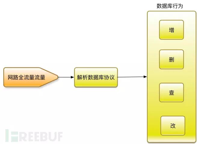 我最推崇的数据库安全产品就是基于流量的数据库审计,因为它不需要更改网络结构,并且也是最关键的是,不影响数据库服务器性能,不用苦口婆心的劝数据库管理员安装监控软件。它可以比较好的发现通过Web漏洞的拖库行为,以及基于数据库通讯协议的数据库管理过程中的违规行为。本质上基于流量的数据库审计就是一种特殊的流量审计,或者说针对数据库的IDS,如图10-11所示,通过从网络全流量中解析数据库协议,进一步还原成数据库常见的增删查改操作,然后在根据预定义的规则进行审计。