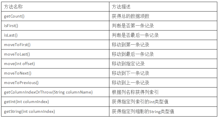 我们可以看到返回的类型都是Cursor,Cursor是一个游标接口,提供了遍历查询结果的方法,如移动指针方法move(),获得列值方法。Cursor游标常用方法如下: