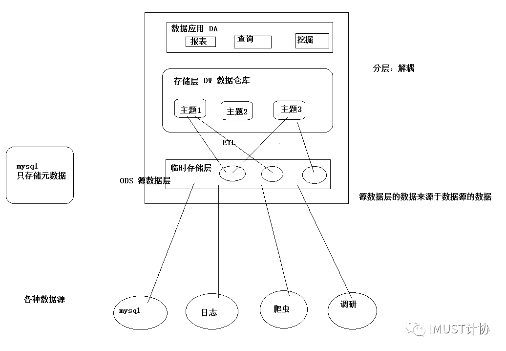 - 数据仓库并不是大型的数据库,也不是为了取代数据库而出现的,数据仓库是在数据库大量存在的情况下,为了进一步挖掘数据资源,为了决策需要而产生的。
