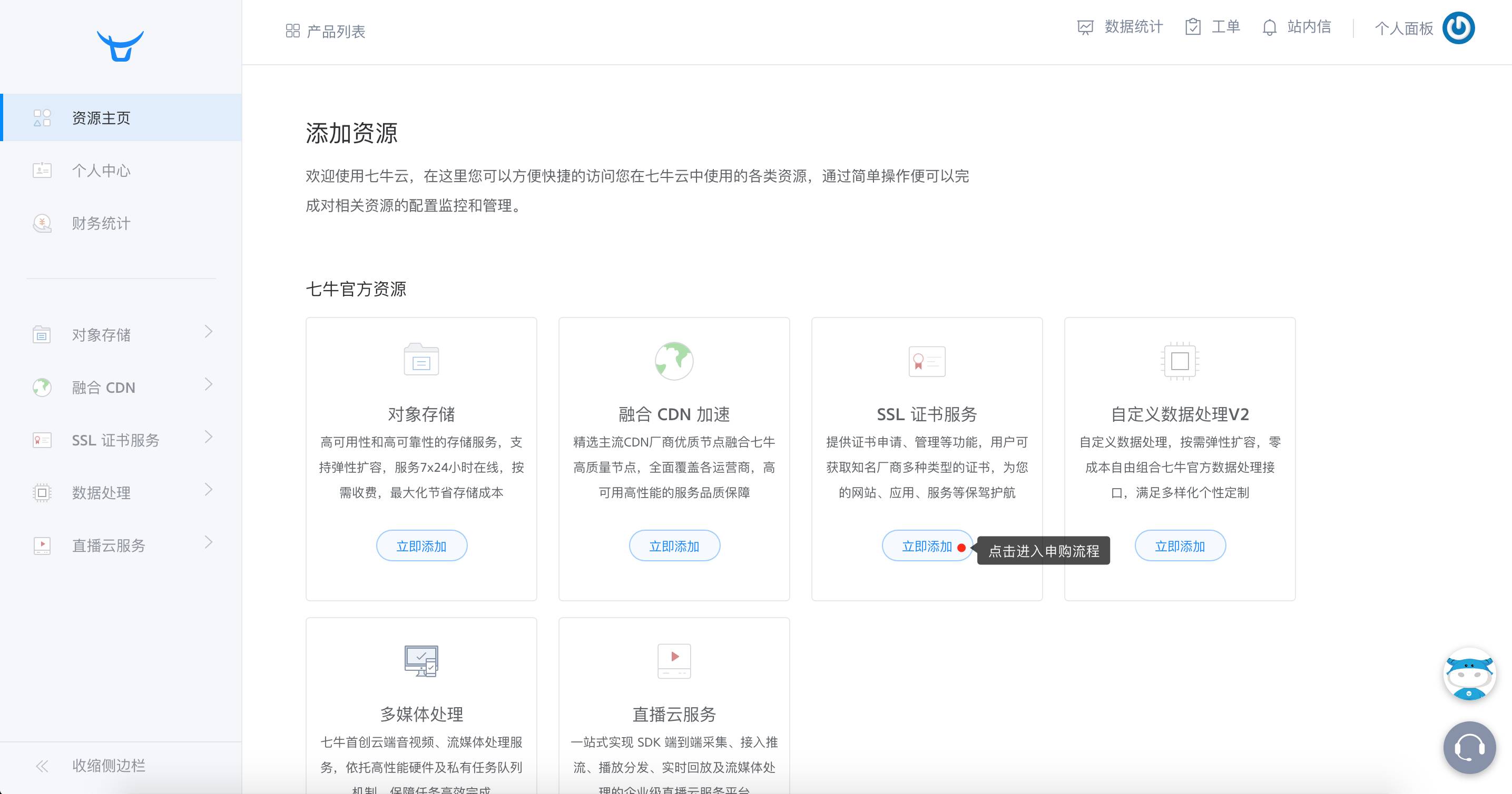 1.登录七牛云控制台,点击 SSL 证书服务->立即添加。