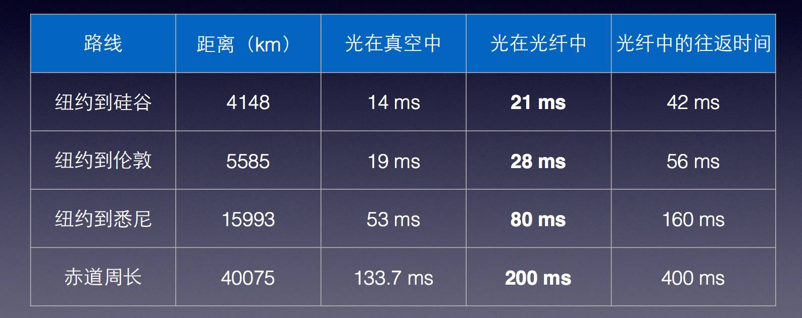 数据在网络上传输,从一个节点经过多级服务器转发到达另一个节点,是不可避免有物理延时的,下面这个表格给出了理论上数据在光纤中的网络传输的时间(实际场景中的延时往往比这个要大很多,因为涉及到带宽、网络抖动等干扰):