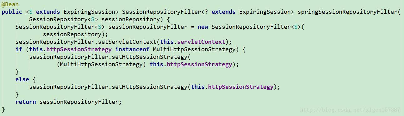 上一过程的DelegatingFilterProxy是从Spring容器中去查找springSessionRepositoryFilter的,那么我们是在哪个地方进行注入springSessionRepositoryFilter的哪?答案是在这里: