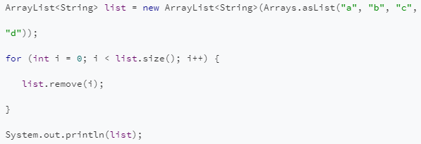 这个示例代码中存在一个非常严重的错误。当一个元素被移除时,该List的大小(size)就会缩减,同时也改变了索引的指向。所以,在迭代的过程中使用索引,将无法从List中正确地删除多个指定的元素。