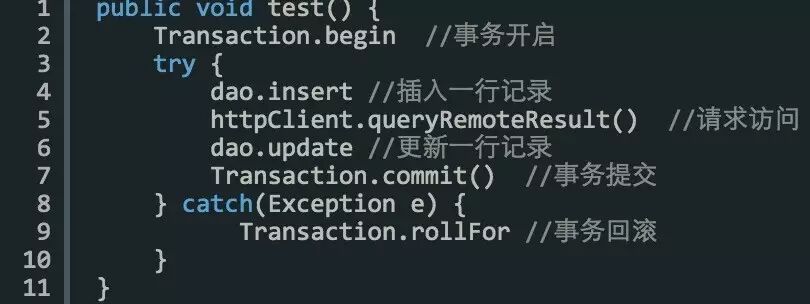 那么我们在用事务的时候,遵循的原则是快进快出,事务代码要尽量小。针对以上伪代码,我们要用httpClient这一行拆分出来,避免同事务性的代码混在一起,这不是一个好习惯。