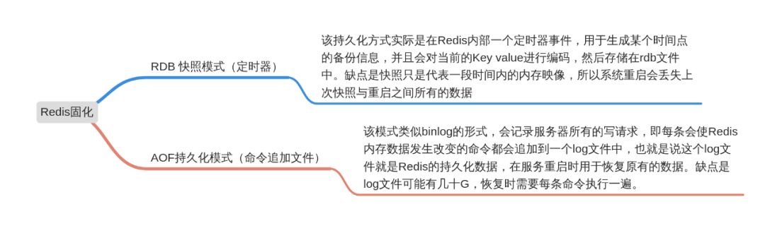 Redis支持固化功能,当数据库崩溃后重启,内存可以迅速的恢复热数据。无需主动或被动的预热,减少因Redis瞬间压力过大导致的后端数据库雪崩风险。 Redis的固化模式分为两种模式,一种是RDB快照模式,另外一种是AOF持久化模式。两者的用途不同,请看下图。