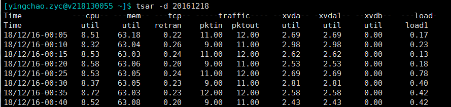 tsar -d 20161218 ##指定查看某天的数据,貌似最多只能看四个月的数据