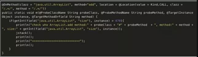 1.查看当前谁调用了ArrayList的add方法,同时只打印当前ArrayList的size大于500的线程调用栈