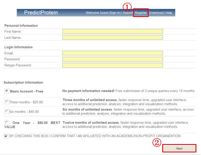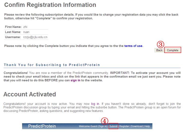 用户需要注册ID、验证E-mail后,才能使用PredictProtein工具。