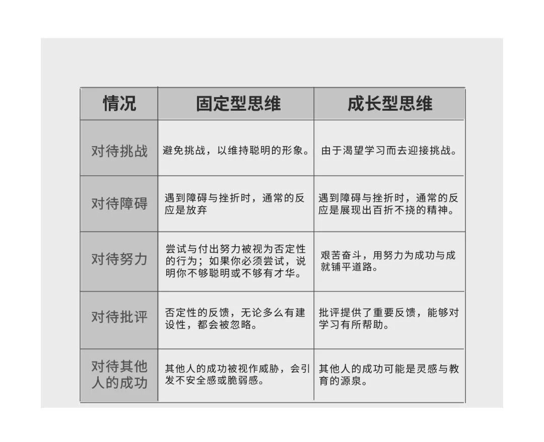 而成长型思维则是一种以智力可塑为核心信念的系统的思维模式。它相信通过练习、坚持和努力,人类具有学习与成长的无限潜力。