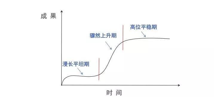 个人成长遵循的是S型曲线,在刚开始的时候,会有非常漫长的平坦状态,而后则会如火箭般骤然升空,并最终在高位保持平稳。