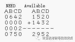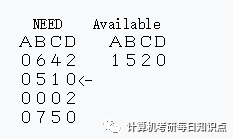 首先搞出三个矩阵,一个Max各个进程需要各个资源的最大数目,Available系统有的各个资源的数目,然后就是Allocation各个进程已经得到的资源数目,然后用