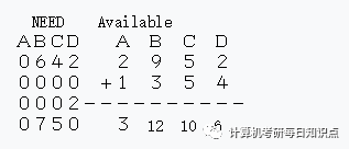 3.这个时候观察四个进程的需求情况和系统能够分配的资源情况,发现P2对于ABCD四种资源的需求都小于系统的资源数目,分配给P2不会进入不安全状态,所以满足P2的请求。然后回收P2资源,注意这里回收的是刚刚分配出去给P2的加上P2已经有的资源。得到下面的矩阵: