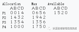 1.首先给出在某个状态下系统的资源情况,是三个矩阵,最大需求矩阵Max,已经分配资源矩阵Allocation,系统可以分配的资源矩阵Available;