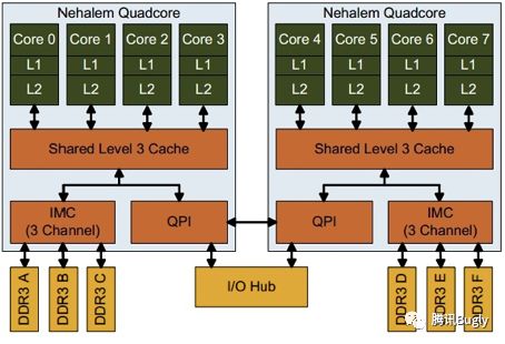 多颗CPU通过QPI连接。再后来,同一个主板上面也可以支持多颗CPU,多颗CPU也需要有通信和控制,才有了QPI。