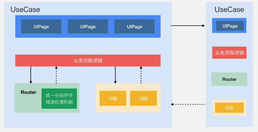 因此,为了适应微信支付流程多,界面跳转复杂的特点。架构抽象的第一步就是将业务流程抽象为一个独立的角色 UseCase。同时, 把界面抽象为 UIPage。 一个大的业务流程可以分解为一个个小的业务流程。