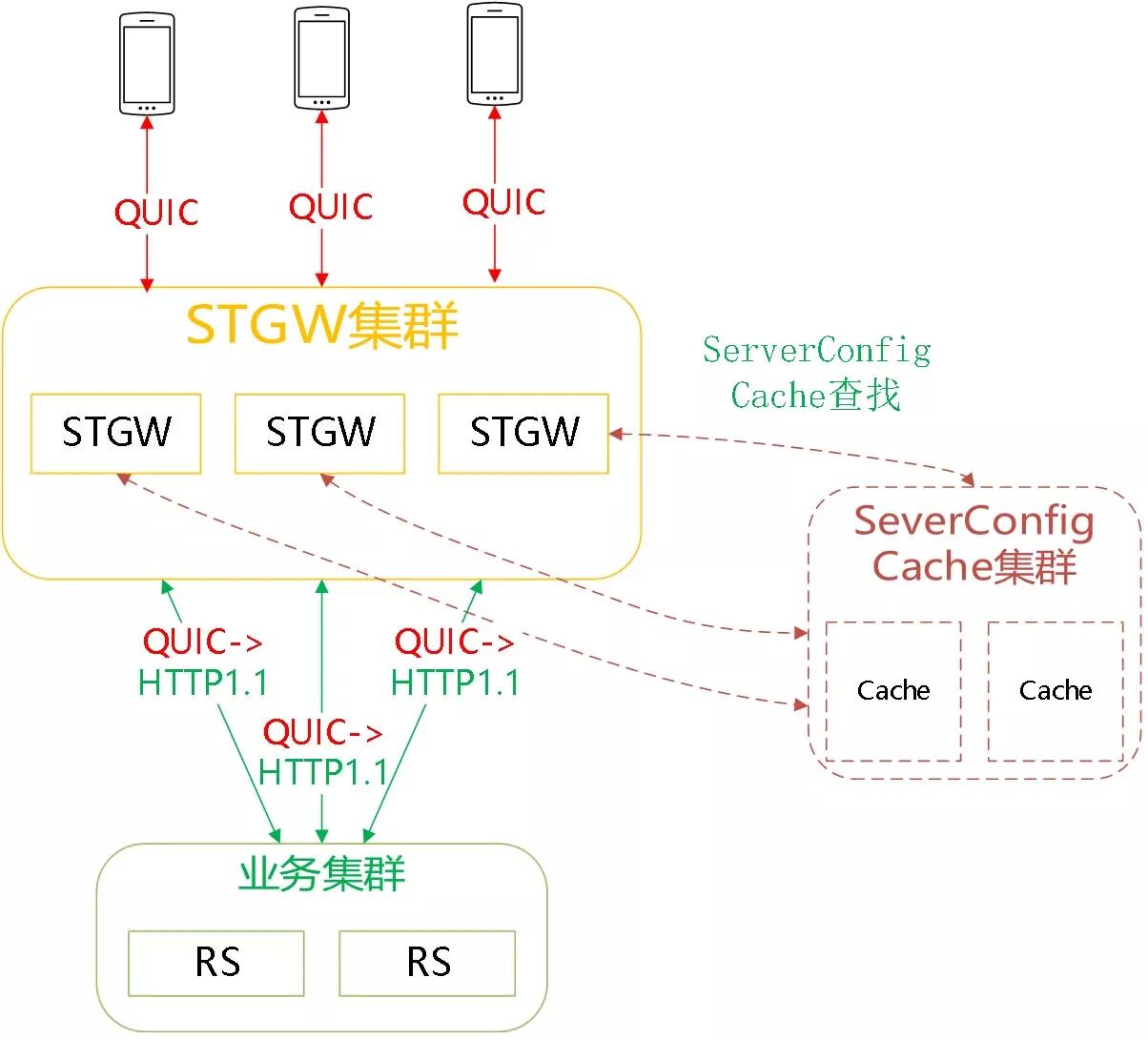 Stgw 在生成 ServerConfig ID 和内容时,会存储到全局的 Cache 集群。用户握手请求落到任意一台 STGW 机器,从全局 Cache 集群都能找到相应的内容,实现 0RTT 握手。