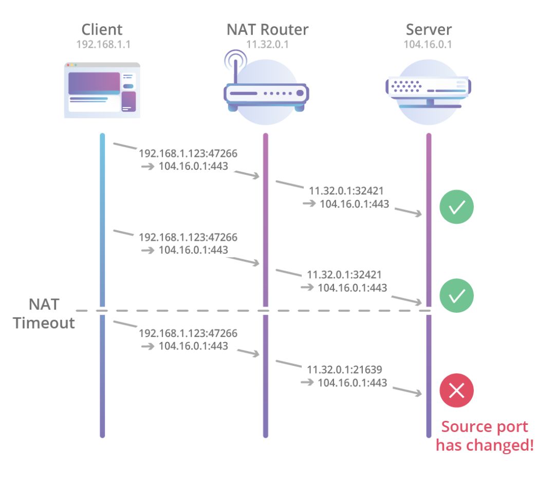 当NAT重新绑定时(例如超时),NAT外部的端点将看到来自与最初建立连接时观察到的源端口不同的数据包,这使得仅使用4元组无法跟踪连接。