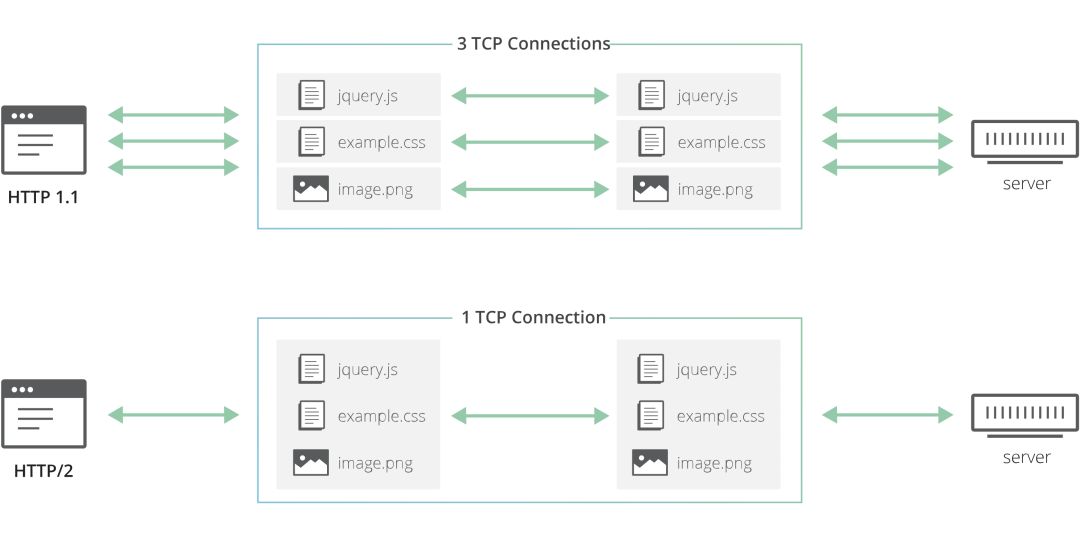 这是一项重大改进,如果想要同时处理多个HTTP/1.1请求(例如当浏览器需要同时获取CSS和JavaScript资源渲染网页时),应用程序需要启动多个TCP + TLS连接。创建新连接需要重复多次初始握手,以及初始拥塞窗口加速,这意味着网页的渲染速度会降低,而多路复用HTTP则避免了这些问题。