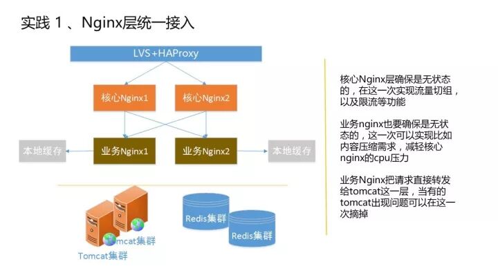 核心 Nginx 主要是前端流量的分配,比如限流、防刷都是在这层去做。下层是业务 Nginx,主要的 Nginx+lua 的逻辑在这一层实现。