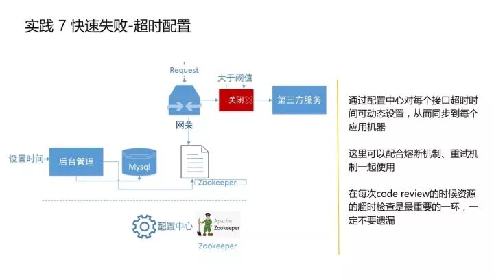 快速失败是非常重要的一个实践,不光是做网关系统,做其他系统也要记住,特别是调用量大的系统,比如注意到整个链条中的超时设置。
