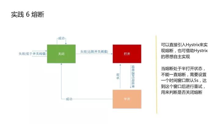 熔断之后还可以有一个设置:比如 5 秒或一分钟之后出来一个半打开状态,再次醒来之后,它会去试探一下当天这个服务是否已经 OK 了,如果没有问题了,它就会去把你之前熔断的 API 业务再次打开,能够正常对外提供服务。