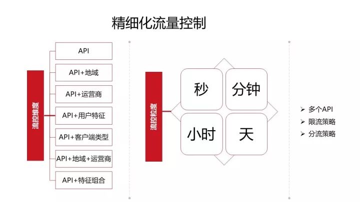 说完开关、流量控制和降级之后,我们来看通过多维度的流量控制和降级的策略,比如按照单个 API 或 API+ 地域、运营商等维度进行控制。