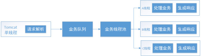 业务逻辑处理和生成响应都是由另外的 Tomcat 线程池处理,从而跟请求线程隔离。这里的业务线程池还可以进一步隔离,不同业务设置不同的线程池。