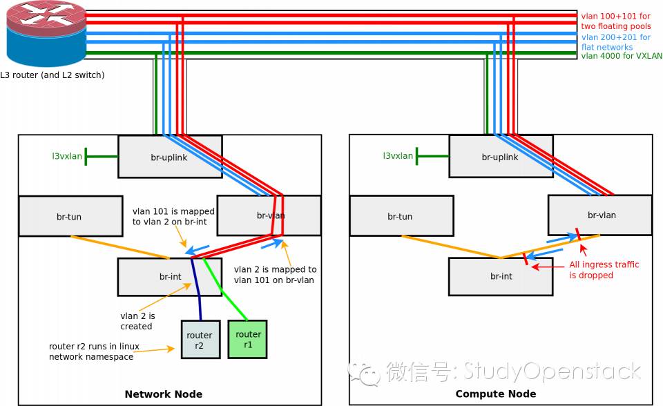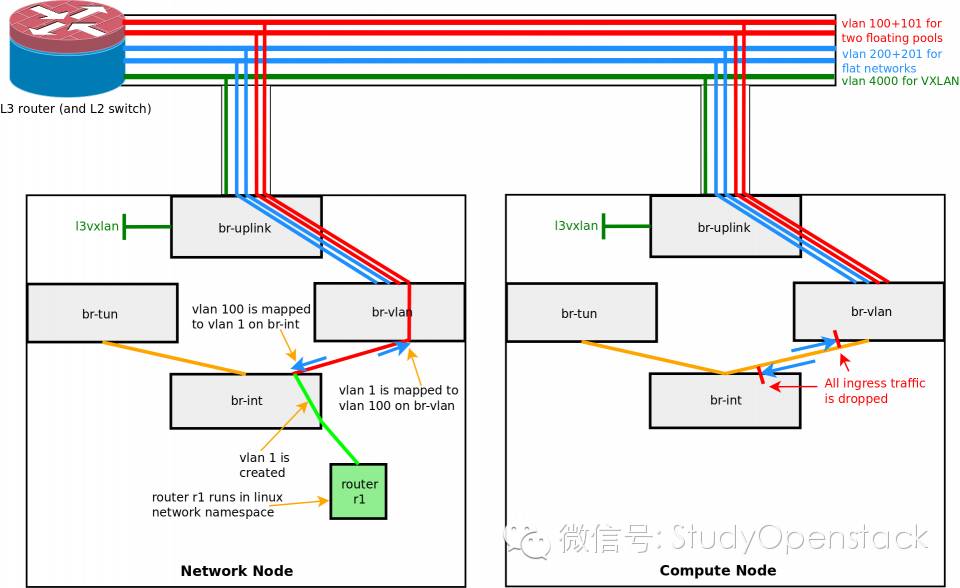 2)router r1对外部网络floating-198-18-0使用的实际vlan=100,因此在neutron的vlan typedriver下br-int与br-vlan桥之间需要做vlan1和vlan100间的转换,以保证router r1对外部网络vlan100提供服务。