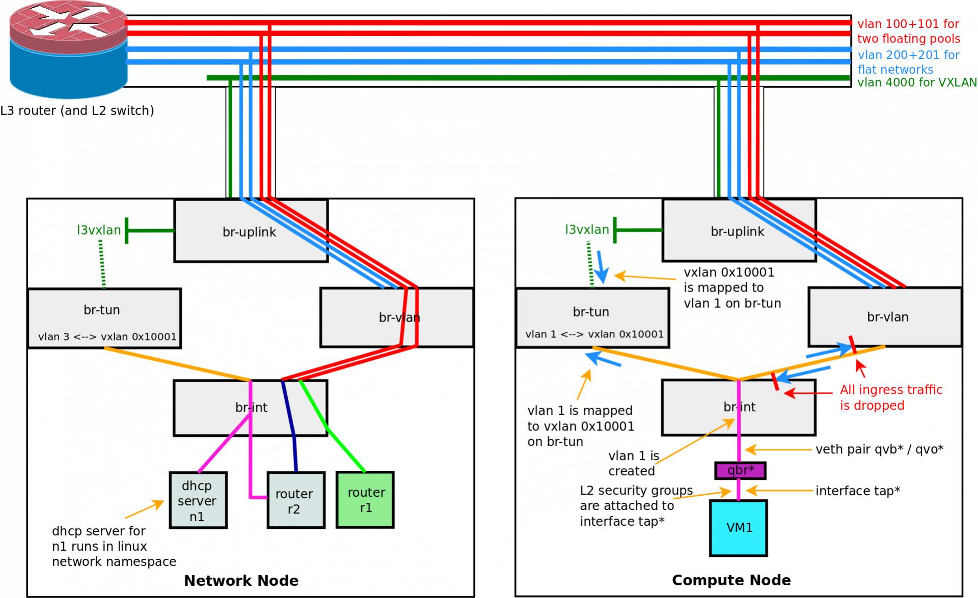 # map vlan --> vxlan cookie=0x0, duration=33.693s, table=4, n_packets=0, n_bytes=0, idle_age=33, priority=1,tun_id=0x10001 actions=mod_vlan_vid:3,resubmit(,10) # map vxlan -> vlan (this is a flooding entry, the traffic is flooded to all nodes in the vxlan mesh) cookie=0x0, duration=33.750s, table=22, n_packets=3, n_bytes=182, idle_age=25,dl_vlan=3 actions=strip_vlan,set_tunnel:0x10001,output:2