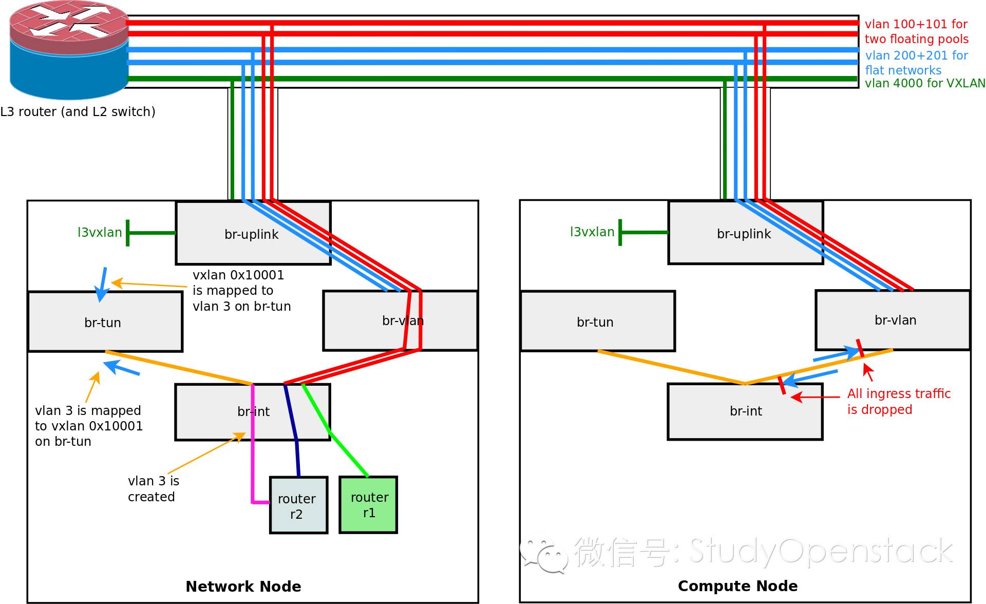 3.br-tun来实现vlan 3与Vxlan 0x10001隧道之间的转换。