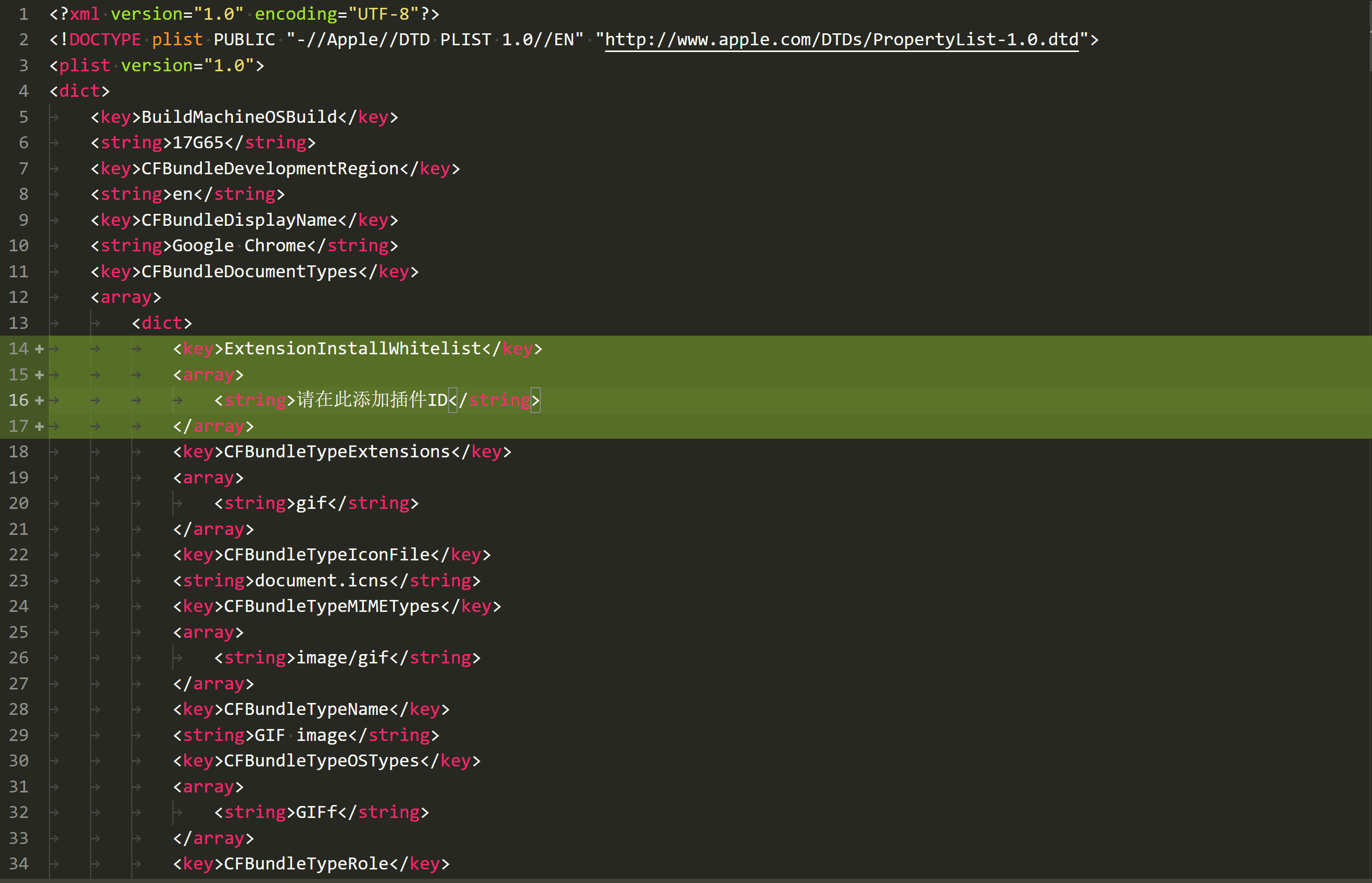 <key>ExtensionInstallWhitelist</key> <array> <string>请在此添加插件ID</string> </array> -