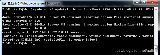 执行mqadmin.cmd updateTopic -n localhost:9876 -b 192.168.12.22:10911 -t demo
