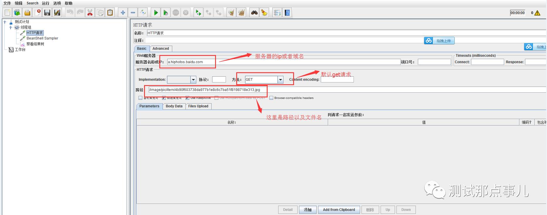 下载文件就是把一个文件保存到本地的过程,咱们Jmeter这次实现下载请求的过程就是下载一张百度上的图片,图片的url是http://a.hiphotos.baidu.com/image/pic/item/4b90f603738da977b1e8c6c7ba51f8198718e313.jpg