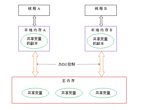 Java内存模型规定了所有的变量都存储在主内存,每条线程还有自己的工作内存中保存了被该线程使用到的变量的主内存副本拷贝,线程对变量的所有操作(读取、赋值等),都必须在工作内存中进行,而不能直接读写主内存中的变量。(注:这里说的工作内存或本地内存都是虚拟出来的,实质上包括了寄存器、缓存或中间的存储器)