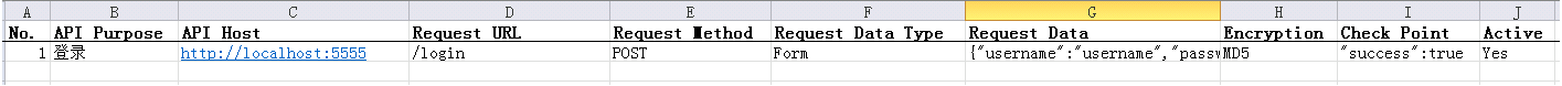 Excel的文件格式如下图,API Purpose记录接口的名称,API Host记录主机地址,Request Methon记录请求方式,可以选择GET或者POST。