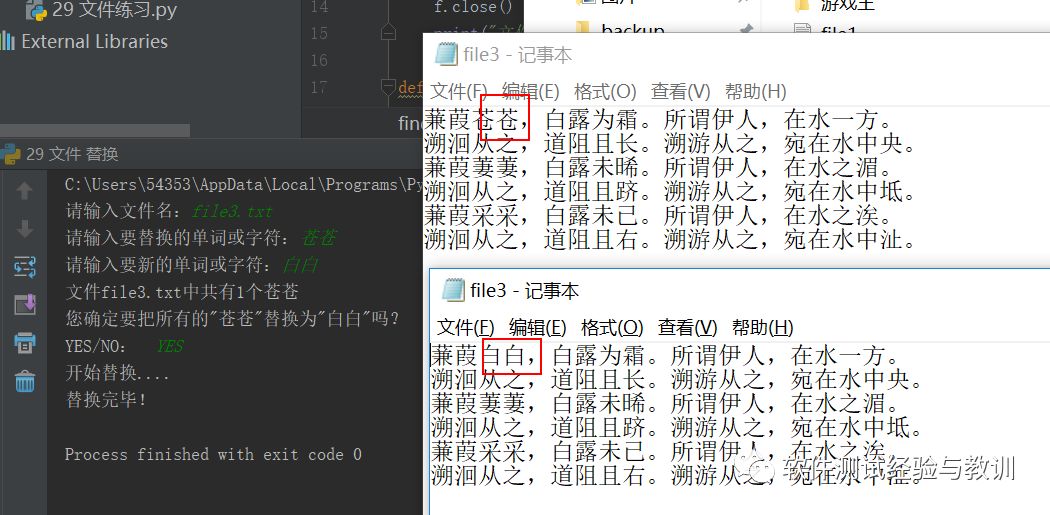 1 def file_replace(filename,fstr,rstr): 2 f=open(filename) 3 content=[] 4 count=0 5 6 for eachline in f.read(): 7 if fstr in eachline: 8 count=eachline.count(fstr) 9 eachline=eachline.replace(fstr,rstr) 10 content.append(eachline) 11 12 decide=input(' 文件%s中共有%s个【%s】 您确定' 13 '要把所有的%s替换为%s吗? 【yes or no】 ' 14 %(filename,count,fstr,fstr,rstr)) 15 16 if decide in ['yes','Yes','YES']: 17 f=open(filename,'w') 18 f.writelines(content) 19 f.close() 20 21 filename=input("请输入文件名:") 22 fstr=input("请输入要替换的单词或字符:") 23 rstr=input("请输入要新的单词或字符:") 24 file_replace(filename,fstr,rstr)